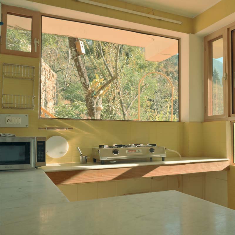 The kitchen is connected to the lower room. This room has a small sitting area and a working desk. We have an inverter for electricity backup and a strong Wi-Fi connection. The kitchen is equipped with a fridge, microwave, gas stove, and cylinder, and all essential utensils.