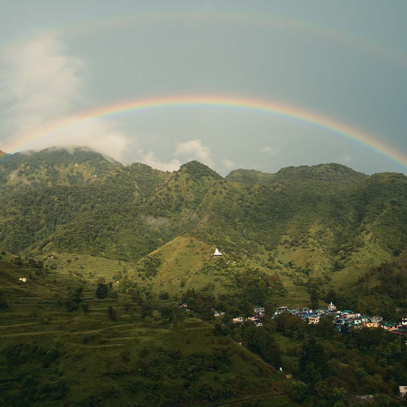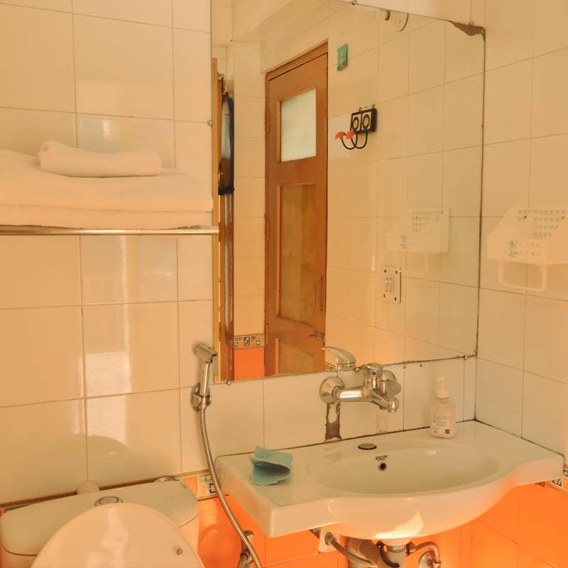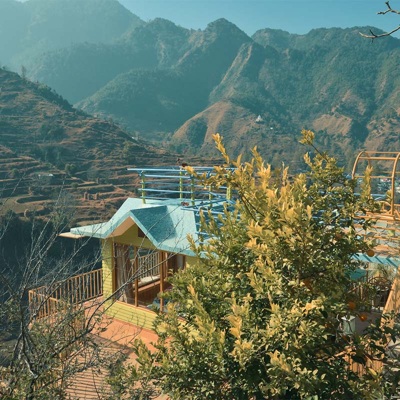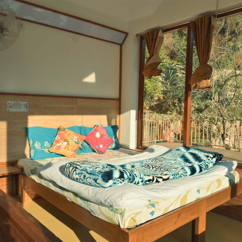 Two bedrooms are one on each floor. Each has an attached bathroom with hot showers and good ventilation. The rooms are connected from the inside by an antique Garhwali wooden ladder. They are also connected from the outside by a staircase.